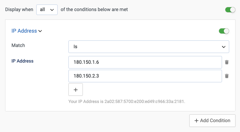 This condition ensures that users from the specified IP addresses won’t see the module, which can be useful for internal testing or restricting access for certain users.