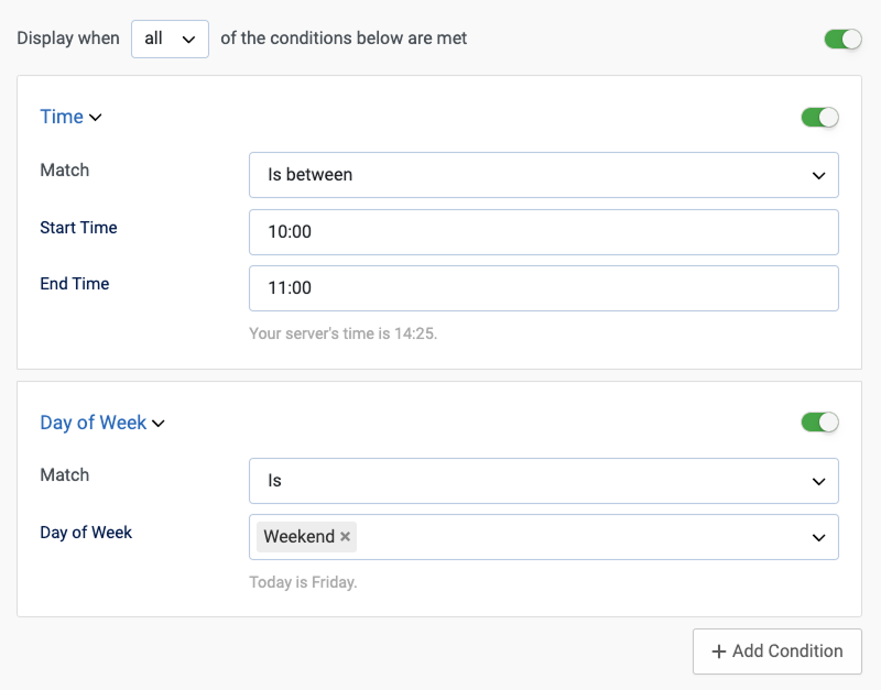 - Date & Time Targeting: Set visibility rules based on specific dates, times, or days of the week, perfect for promotions or seasonal content.