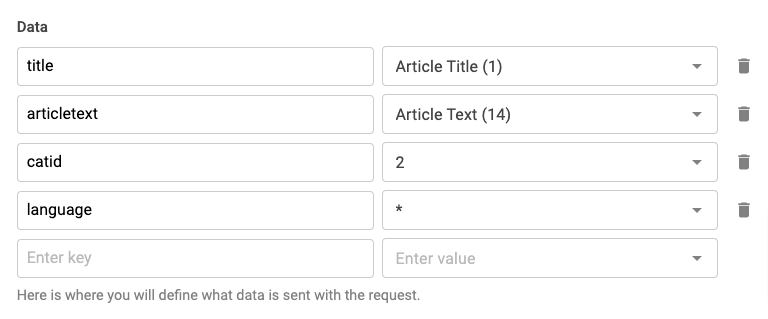 Similar to the Headers, the Data setting lets you define the keys and values that will be sent in the body of your webhook’s request.